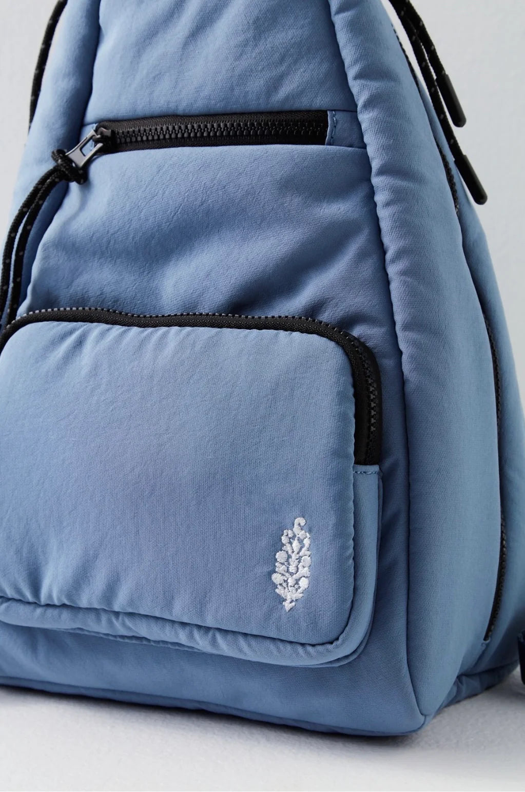 Features: Sling style, triangular design, puffy ripstop fabrication, 2 front zipper pockets, back mesh slide pocket, mesh interior lining, double-zipper main compartment access, rope zipper accents, padded shoulder strap with center zip to convert to backpack, buti logo