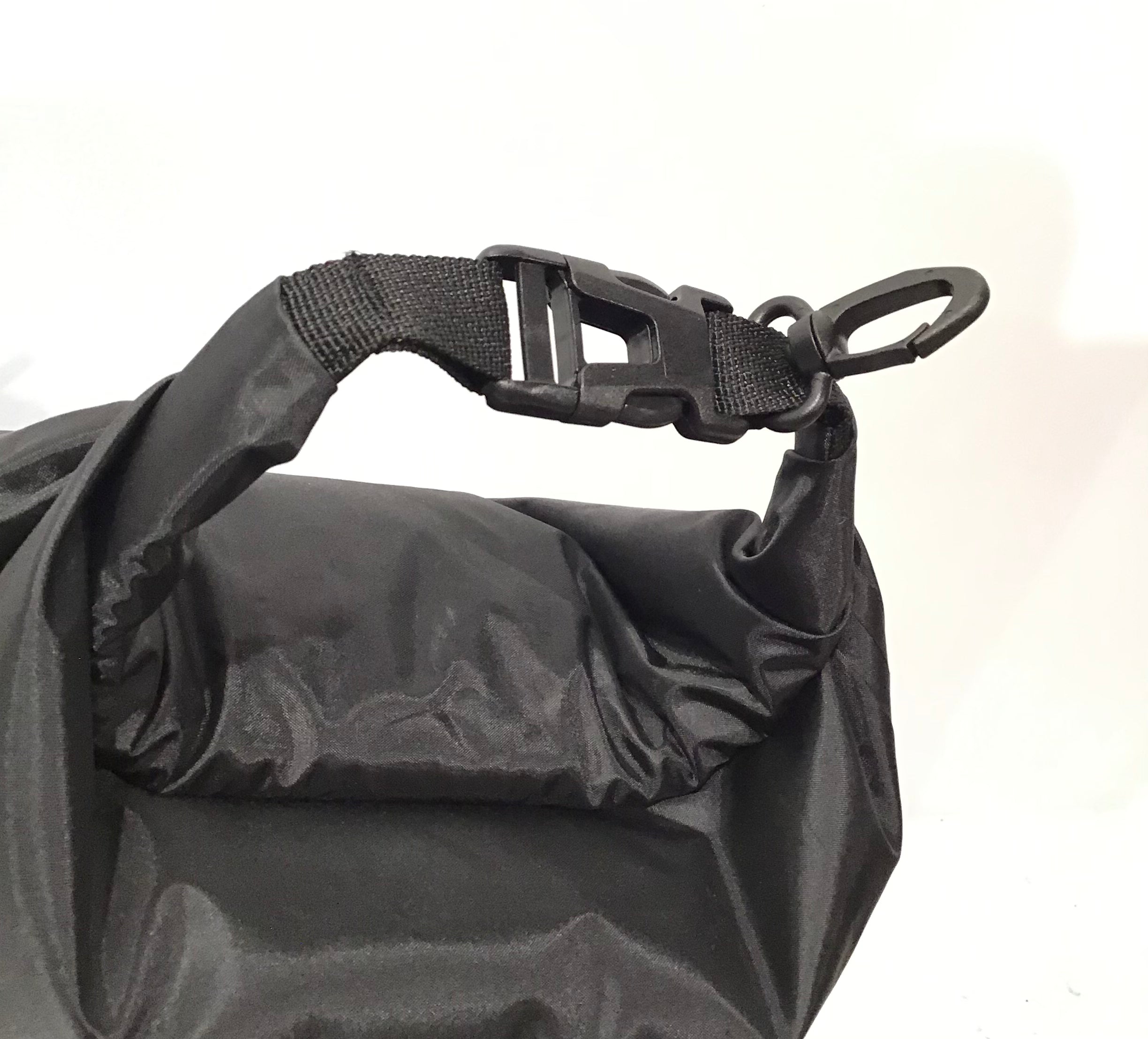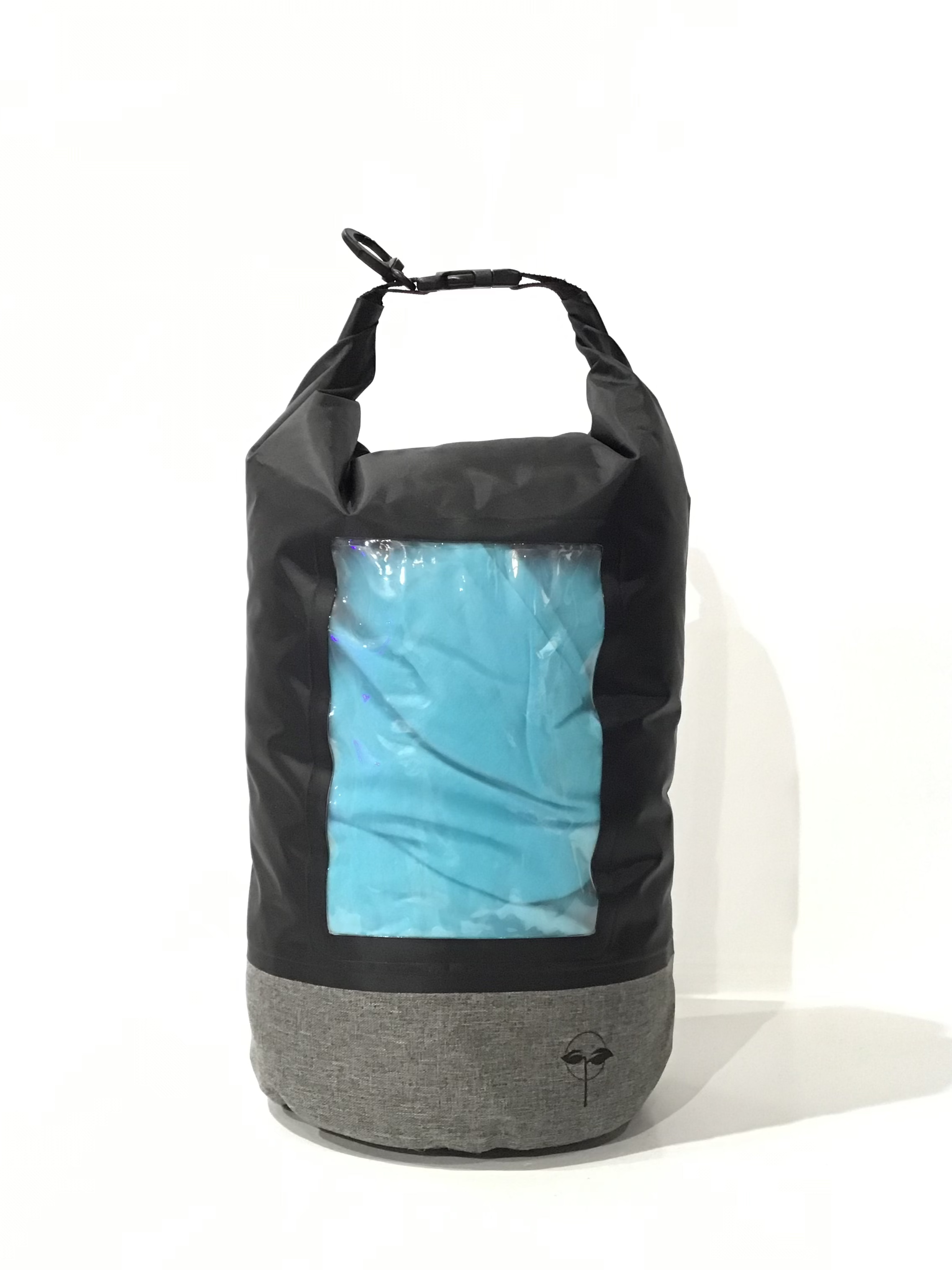 The Dry Bag features eco-friendly, recycled materials, taped waterproof seams, roll top and buckle closure with carabiner clip. Attached carabiner clip. The main compartment is 100% waterproof and keeps contents dry.