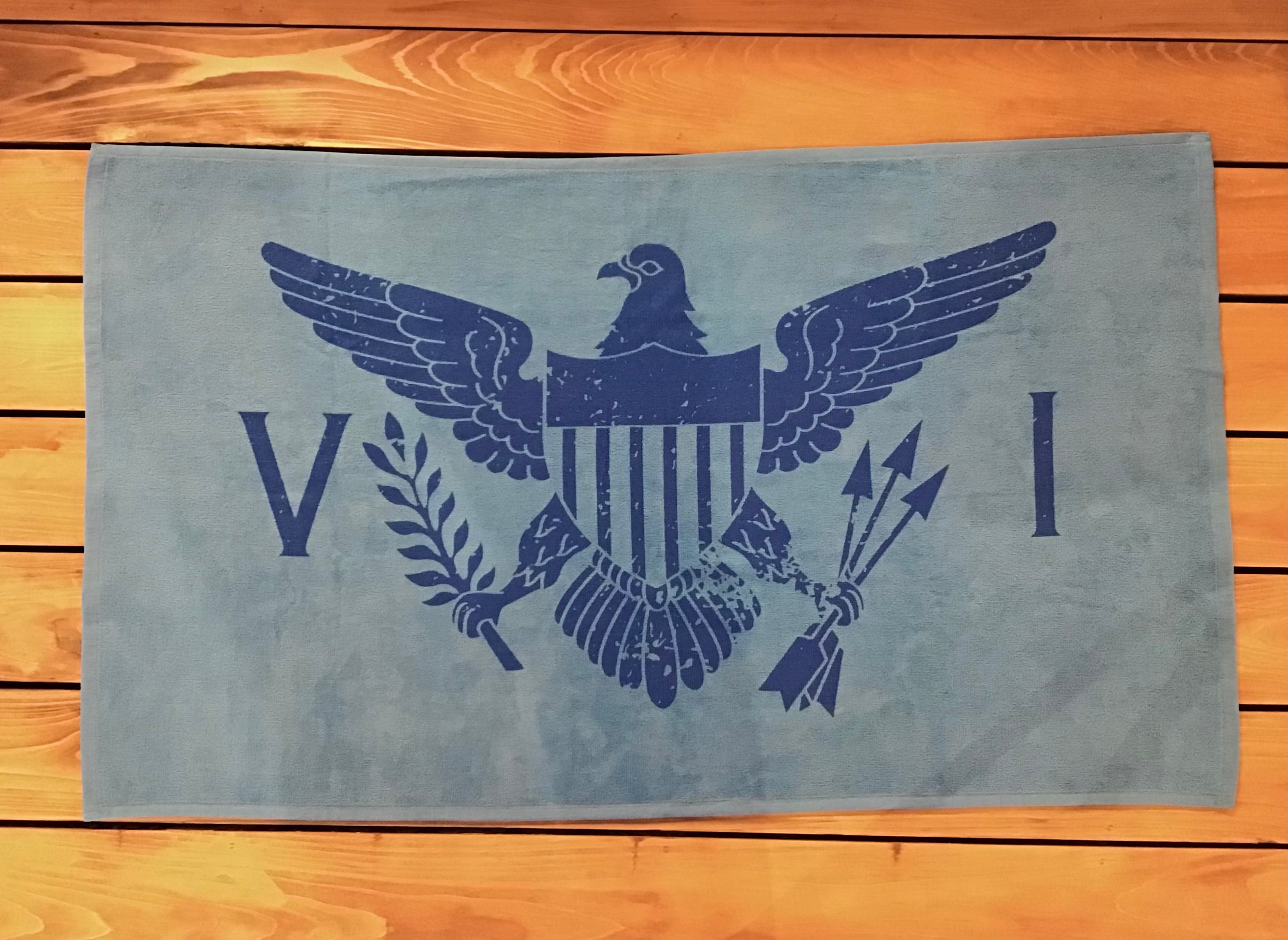 This 100% Cotton, Blue towel features a US Virgin Islands Flag Design printed in Dark Blue. The towels compact size makes it perfect to throw in a beach bag for a day out at the beach or on a boat.