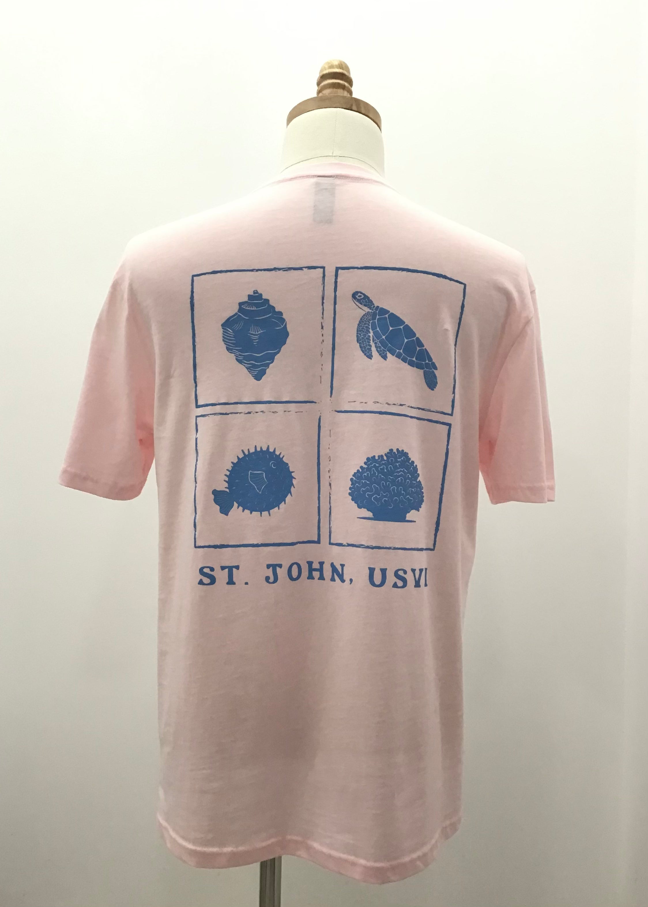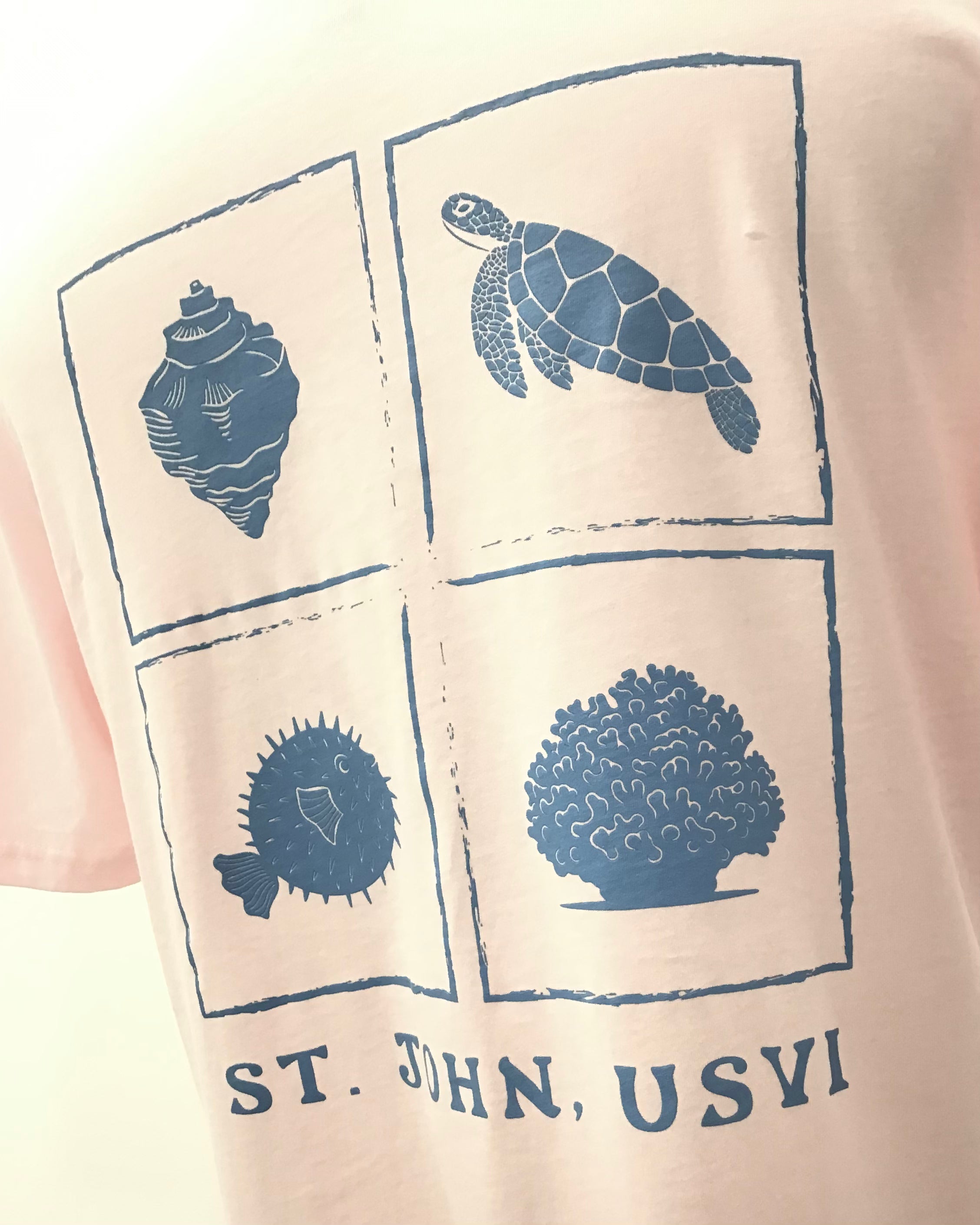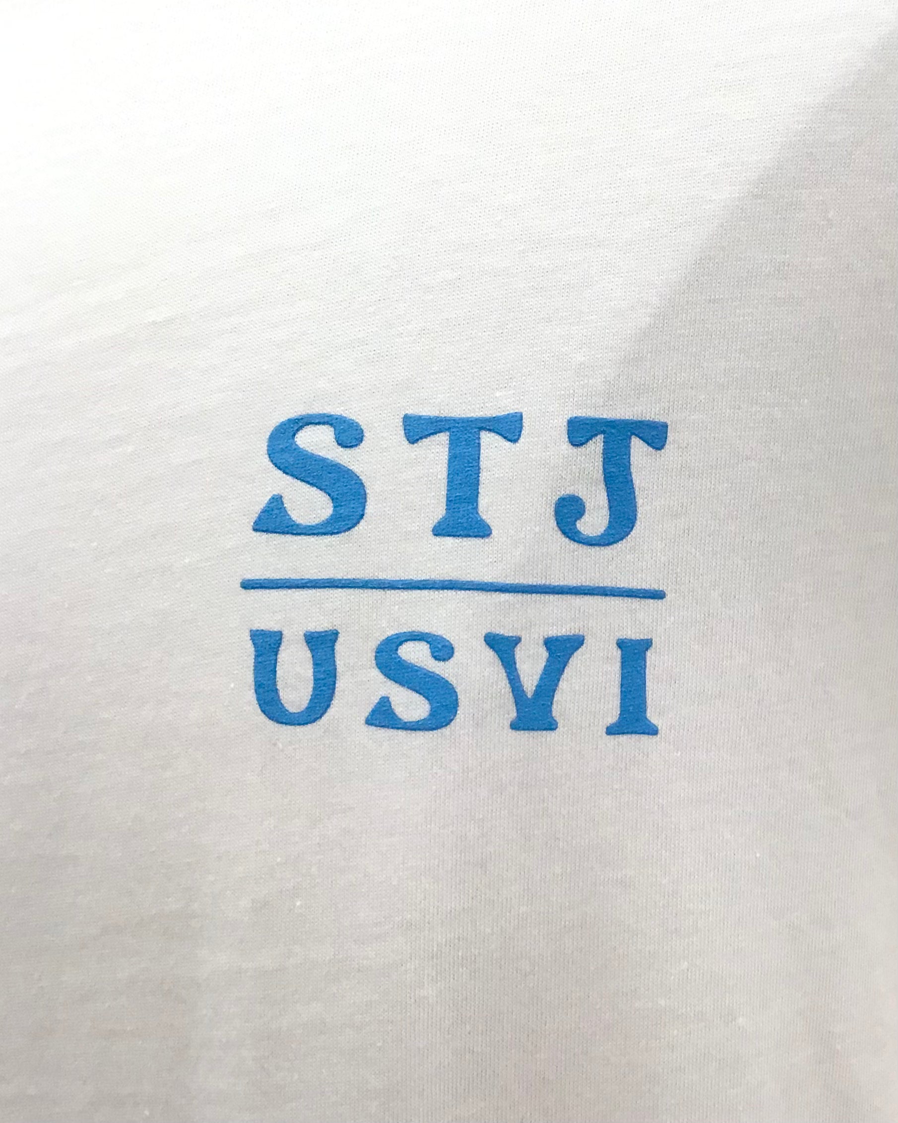 The STJ | Ocean Life T-Shirt features the blue Ocean graphic on the back and St. John USVI graphic on the front. Made from 100% Cotton, this T-shirt is breathable and comfy.