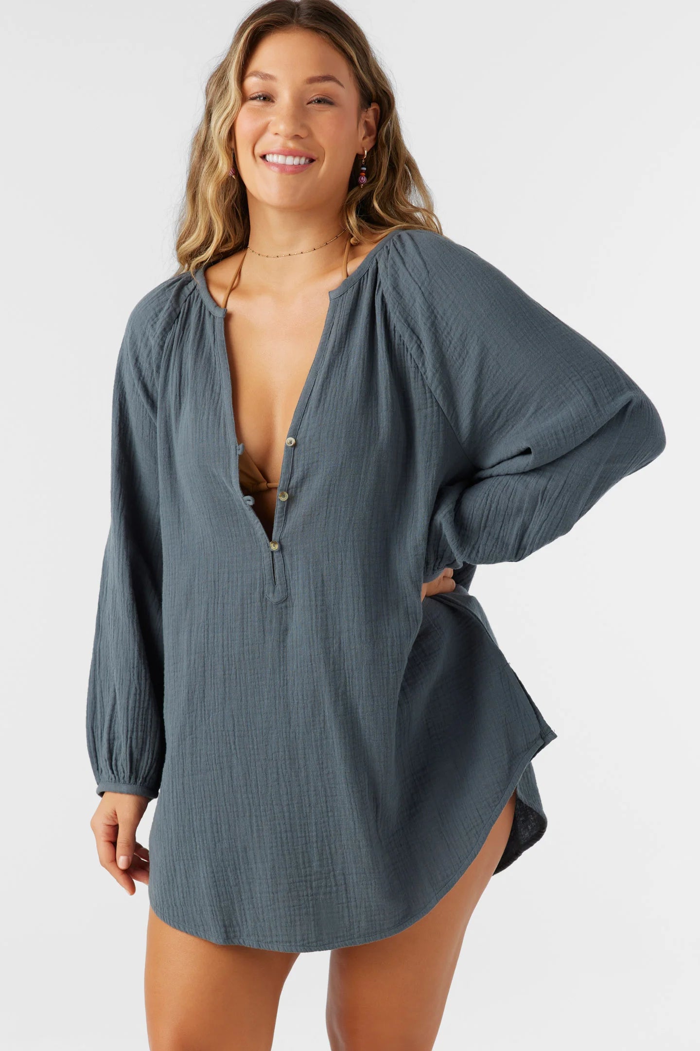 A flowy cover-up dress that has a relaxed long sleeve design and mini length fit.