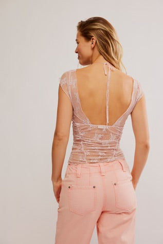 Features: Lace fabrication with floral detail, plunging neckline with wrap detail at bust, cap-inspired sleeves, low open back, adjustable tie at back of neck