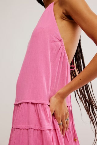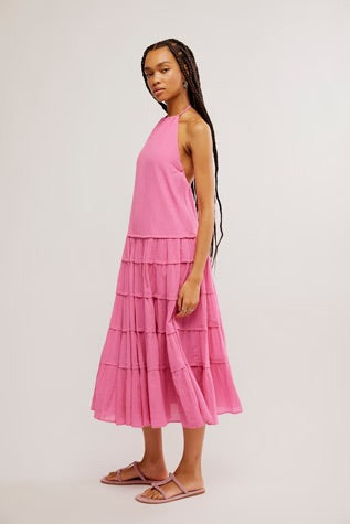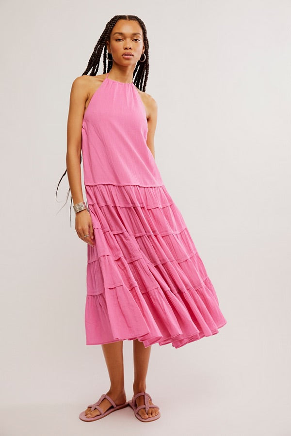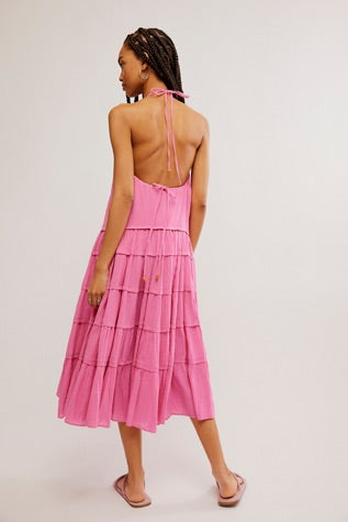 A decadently tiered silhouette and backless design will have you dreaming of somewhere sunny in a halter midi dress cut from fresh cotton gauze.