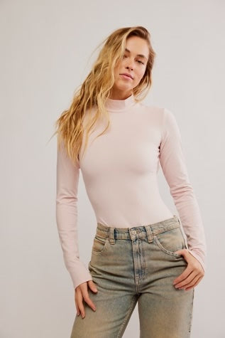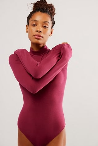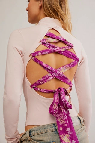Features: Soft fabrication, long fitted sleeves, turtle neckline, button gusset, open back with patterned lace-up straps