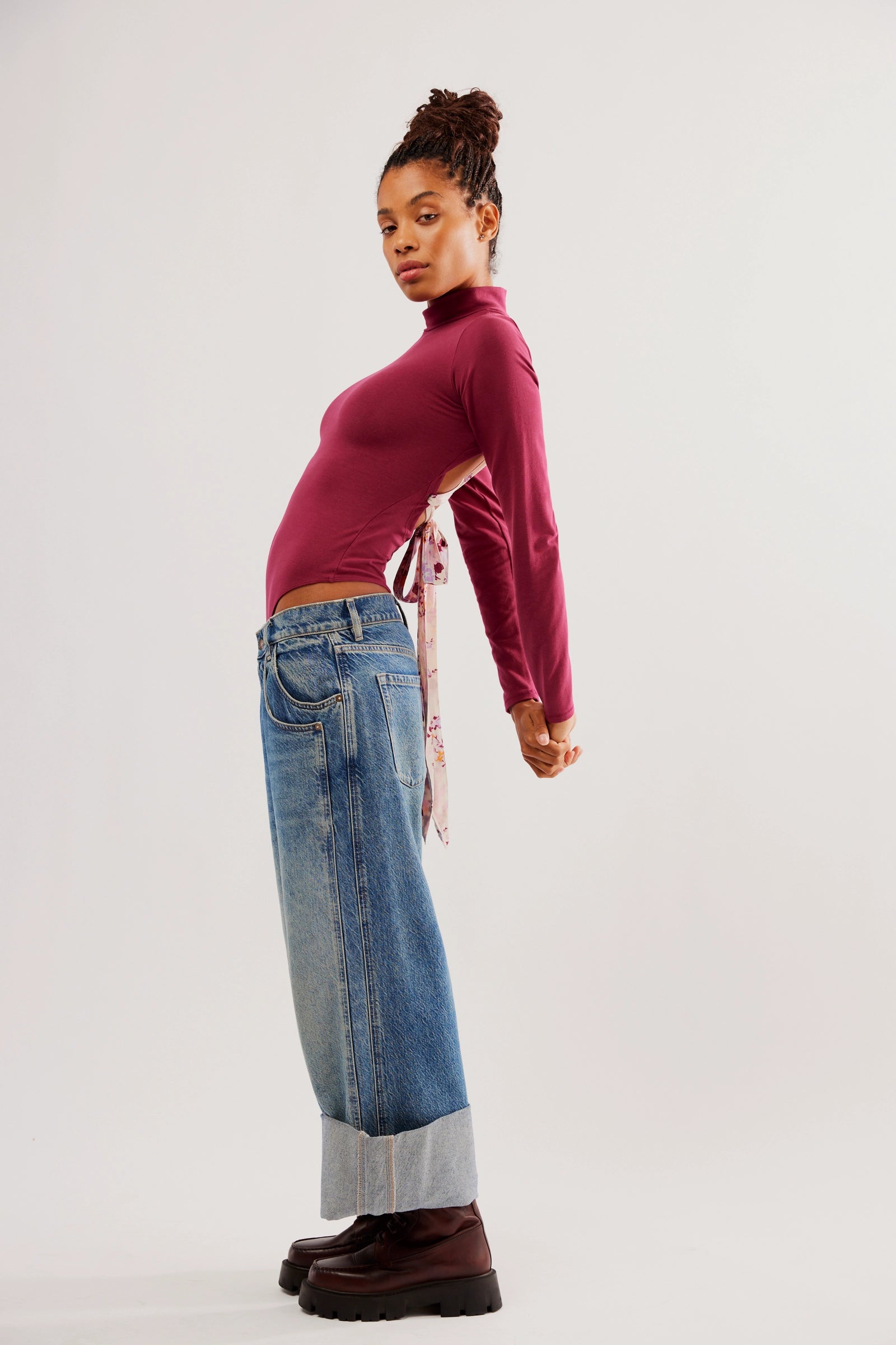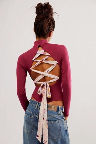 Business in the front, party in the back; this basic turtleneck bodysuit gets transformed with an open back and patterned strappy ties.